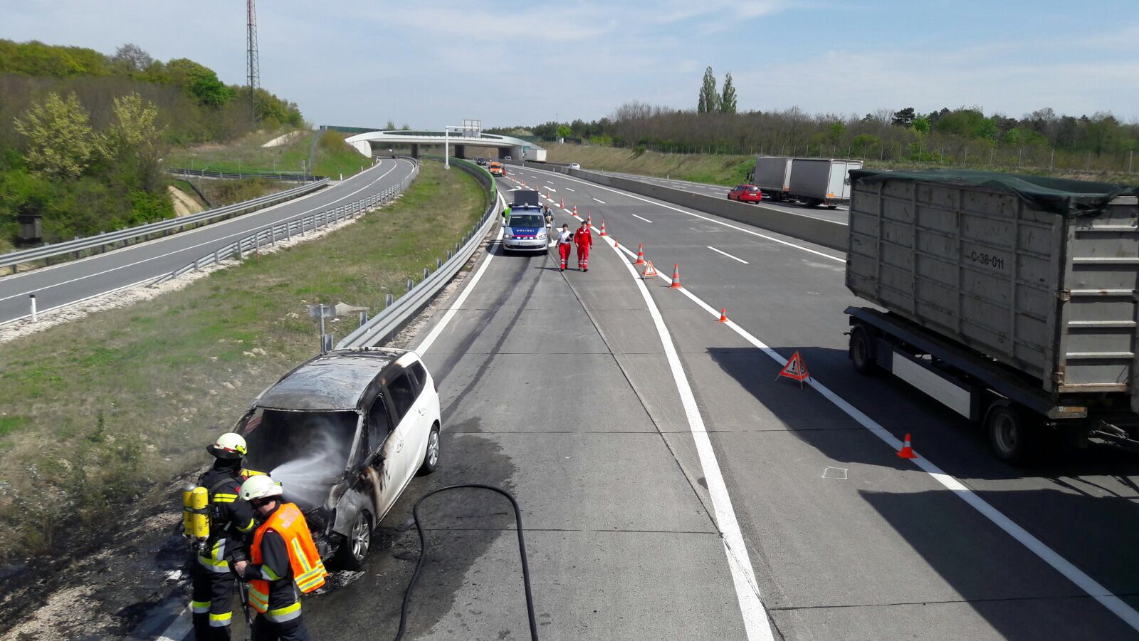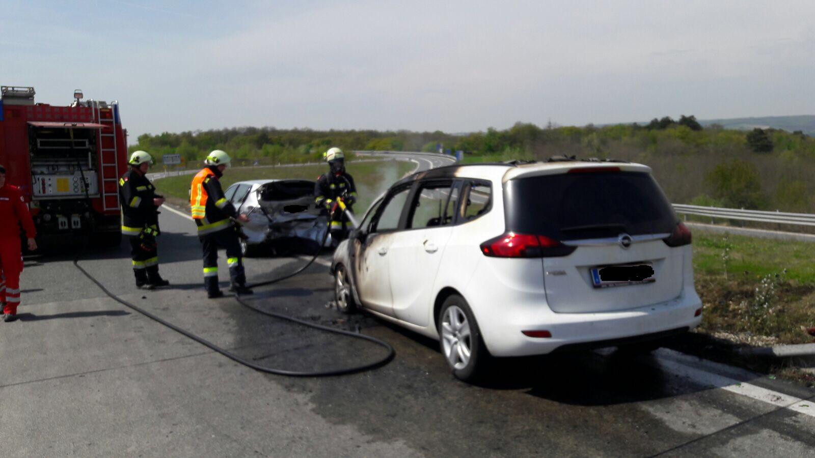 Nachdem beide beschädigten PKWs am Fahrbahnrand zum Stehen kamen, brach im Motorraum des hinteren Fahrzeuges plötzlich ein Feuer aus. Am Weg zum Einsatzort war bereits von weitem eine dicke Rauchsäule sichtbar. Wir sicherten sofort nach der Ankunft die Unfallstelle ab. Parallel dazu begannen die Atemschutzgeräteträger mit der Brandbekämpfung. Anschließend wurde das Fahrzeug mit Hilfe der Wärmebildkamera auf Glutnester untersucht. Glücklicherweise wurde bei dem Verkehrsunfall keiner der beiden PKW-Insassen verletzt. Nach einer Stunde konnten wir schließlich die Einsatzbereitschaft wiederherstellen.