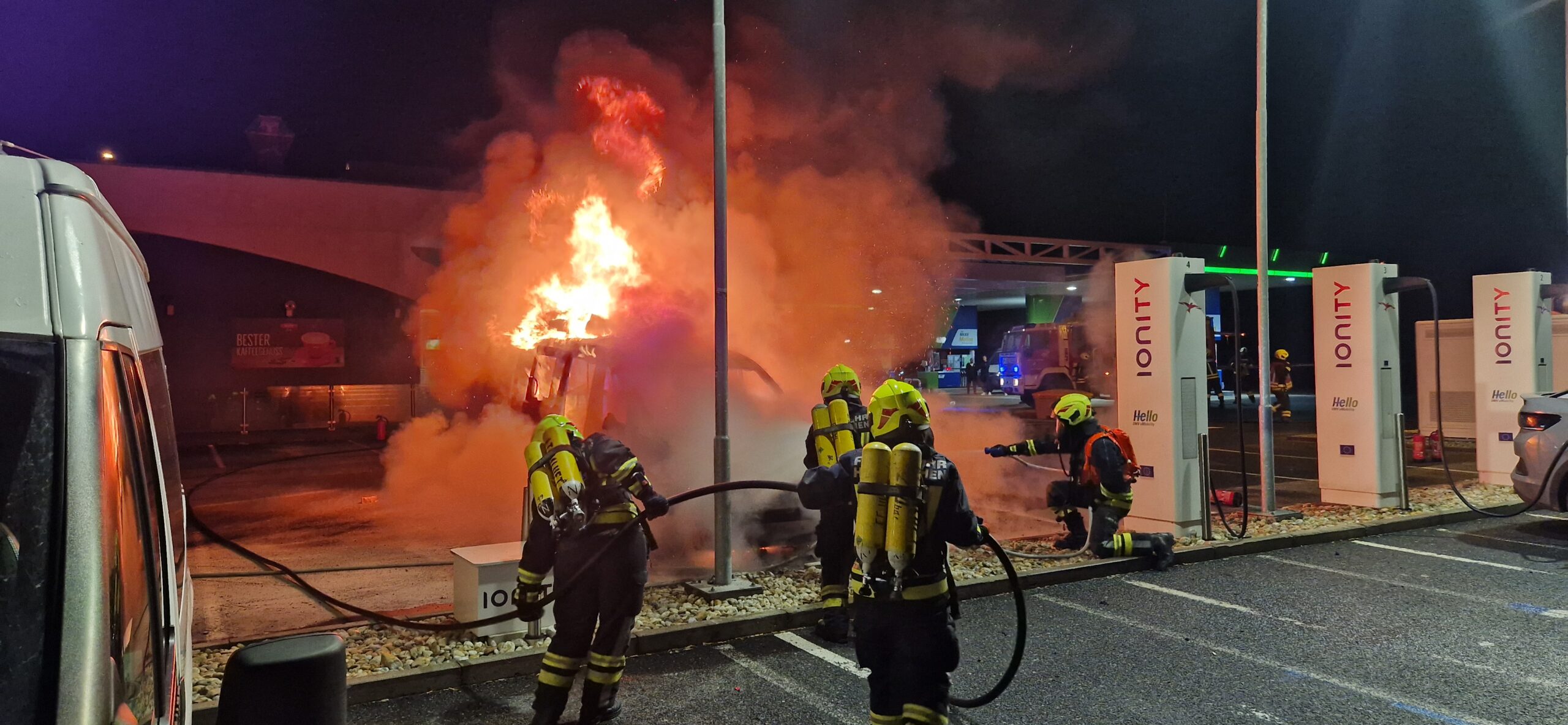 Bereits auf der Anfahrt rüsteten sich die Atemschutzgeräteträger für die sofortige Brandbekämpfung aus. Der Brand war dabei schon von Weitem sichtbar. Aufgrund des bereits ausgedehnten Brandes zeigten die ersten Löschmaßnahmen der Ersthelfer mit Feuerlöschern keine Wirkung mehr. Das Fahrzeug befand sich in gefährlicher Nähe zu einer Hochvoltanlage sowie zur Tankstelle, weshalb besondere Vorsichtsmaßnahmen getroffen wurden.