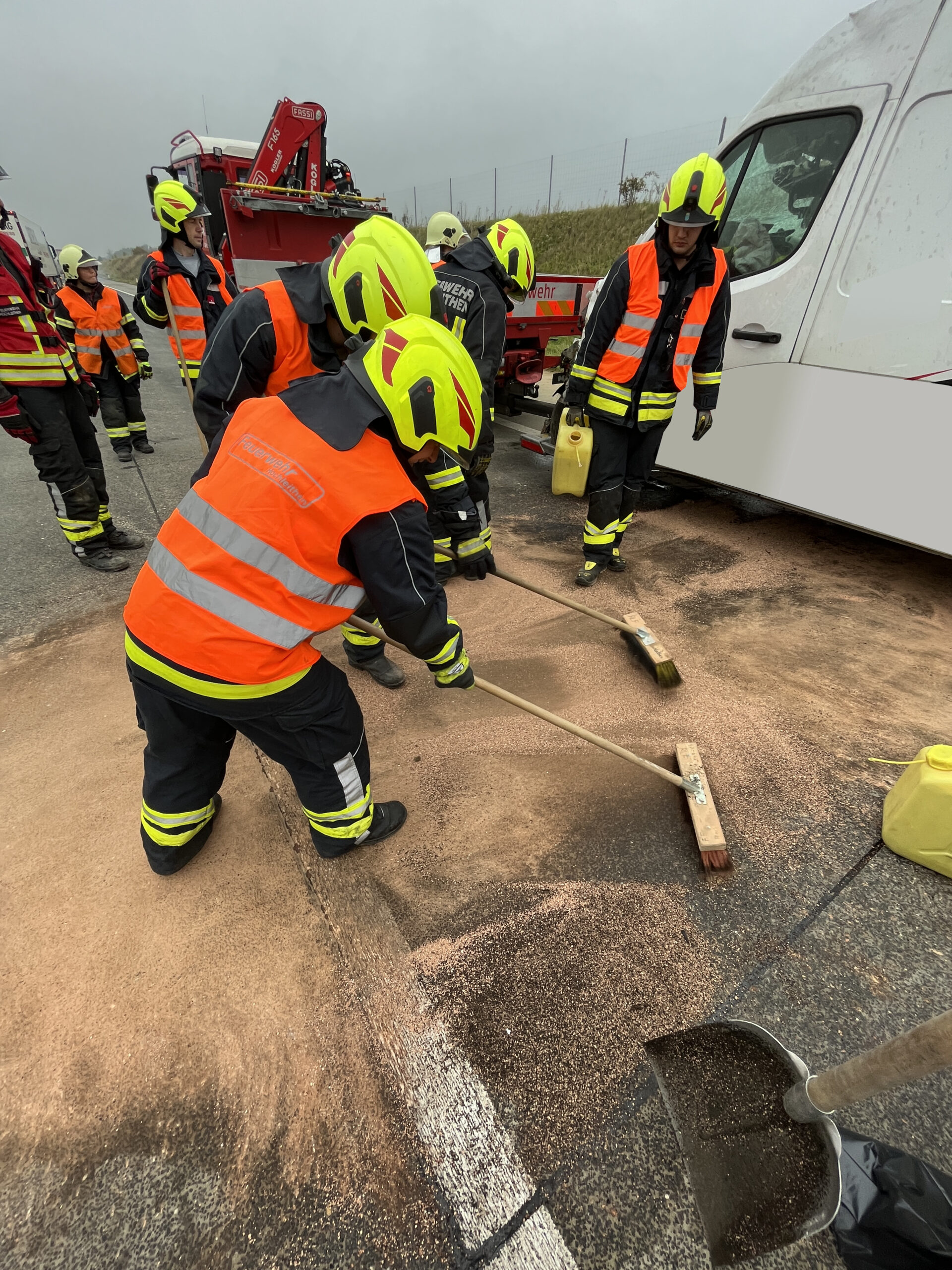Nachdem der Unfalllenker bereits durch das Rote Kreuz versorgt wurde, führten wir das Binden der ausgelaufenen Betriebsmittel durch und unterstützten die Bonaventura bei den Aufräumarbeiten.