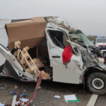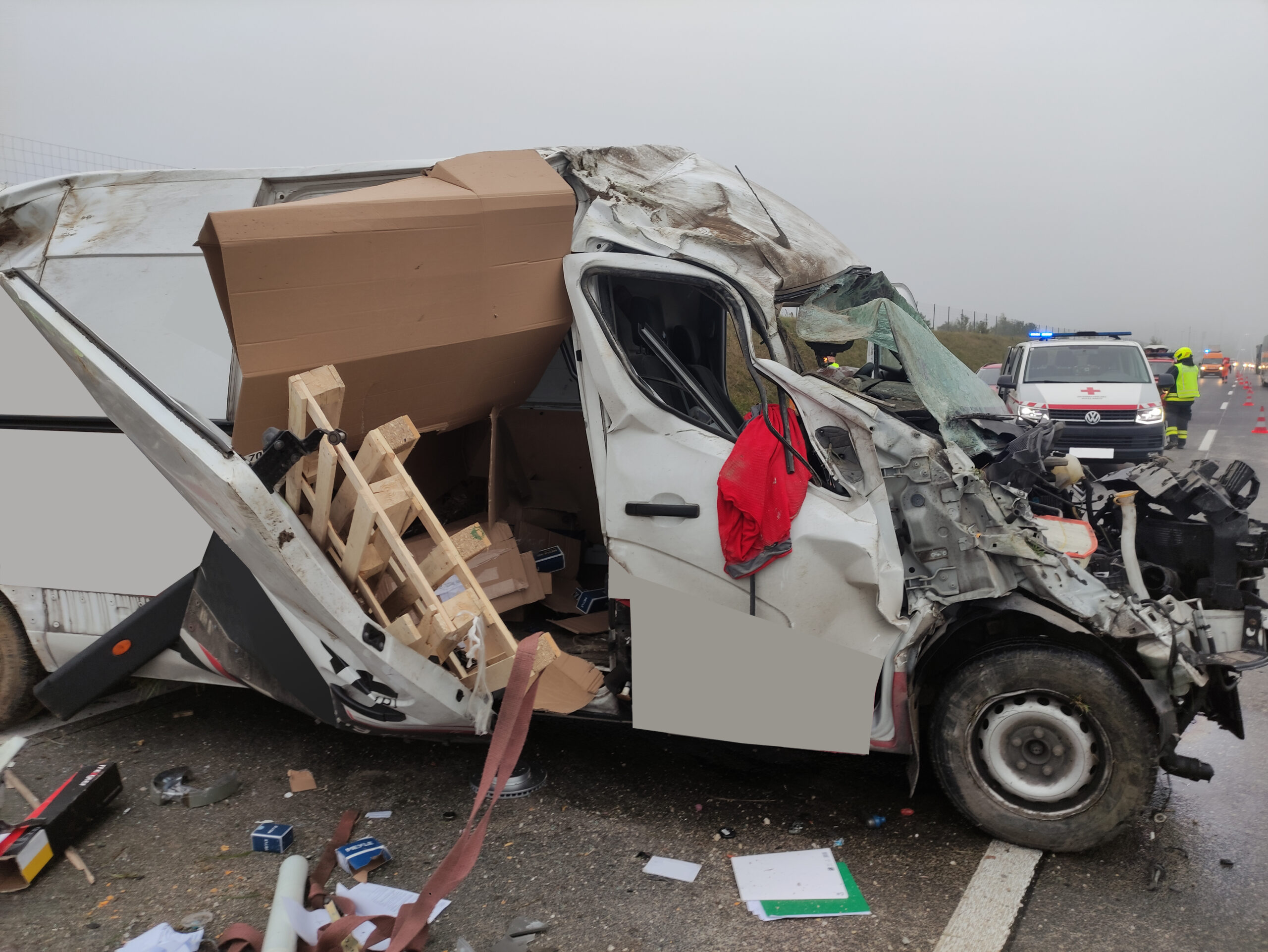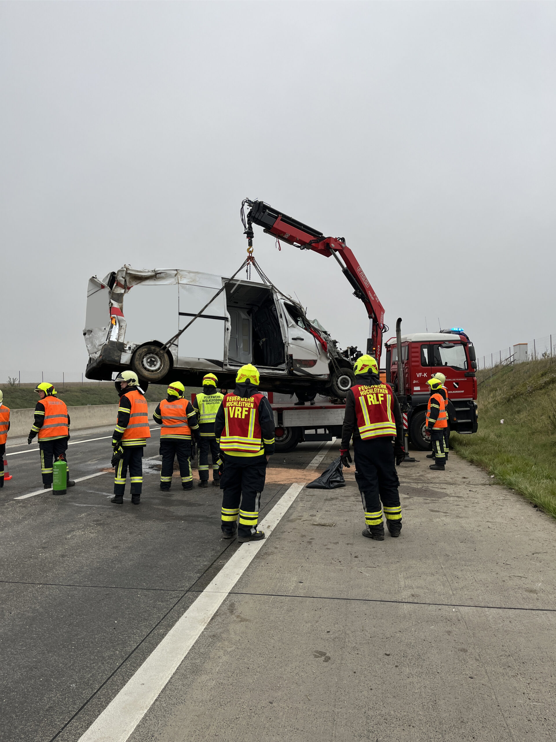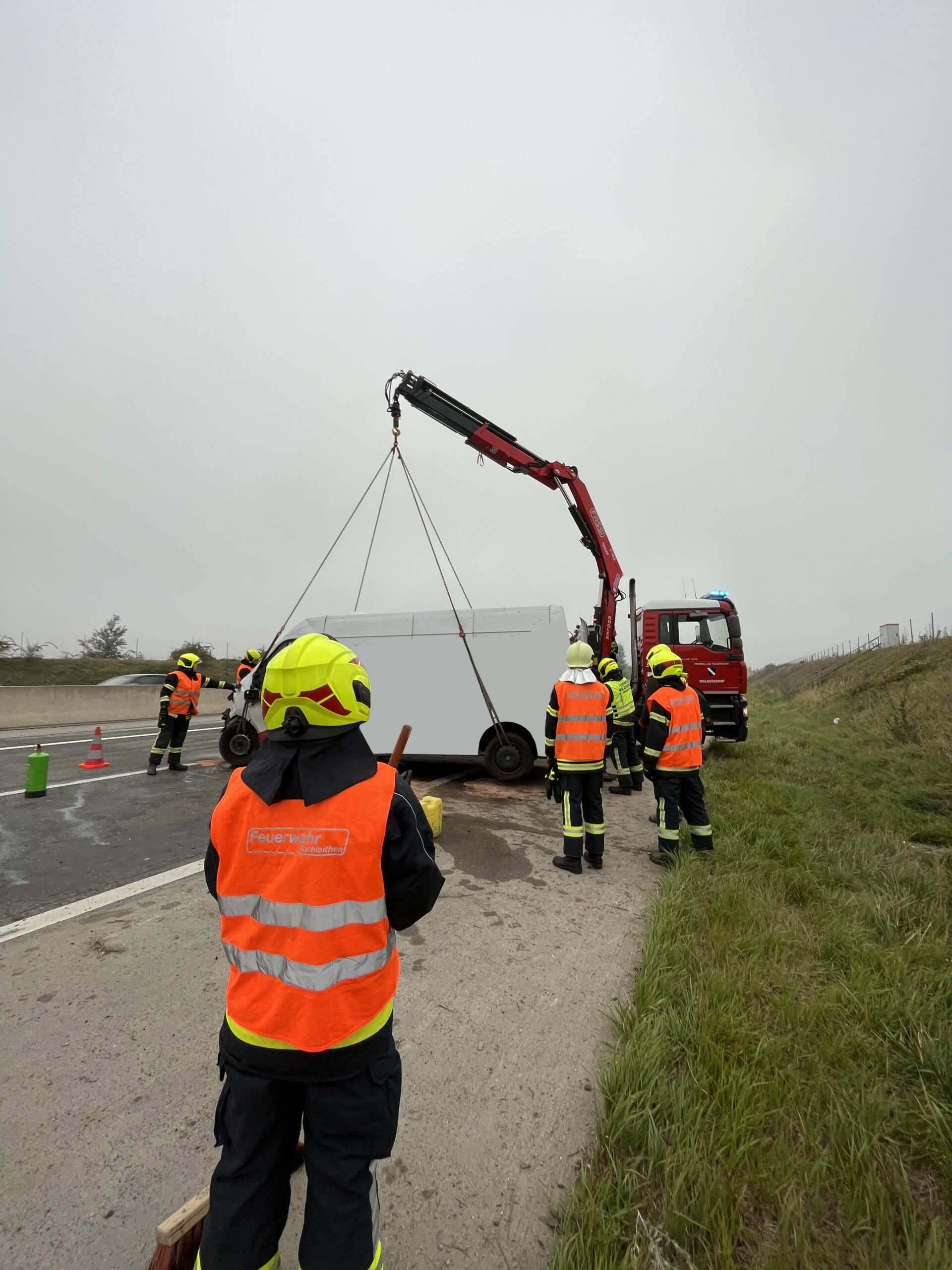 Vor Ort bot sich das Bild eines Kleintransporters, welcher nach einem Überschlag quer auf der Fahrbahn zum Stillstand gekommen war.
