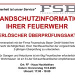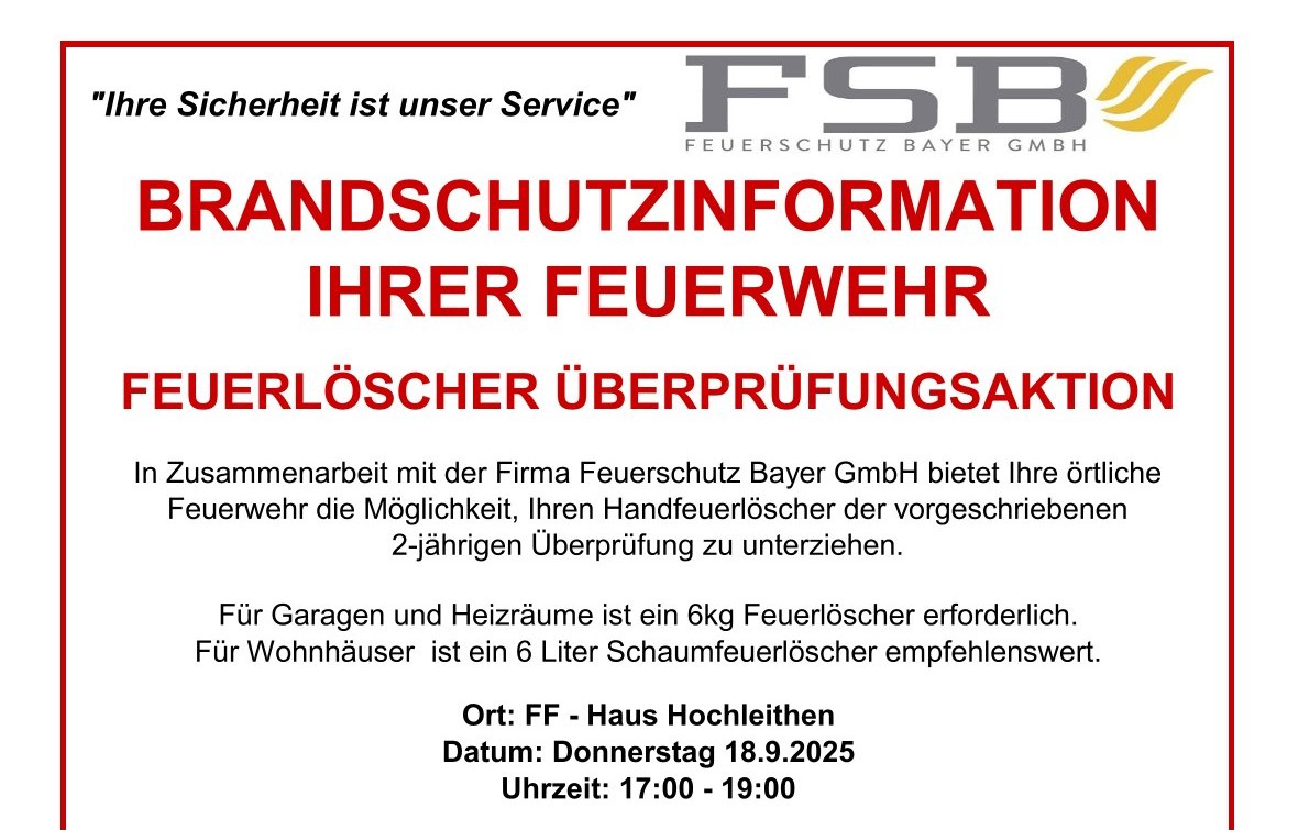 Die Freiwillige Feuerwehr Hochleithen bietet Ihnen in Zusammenarbeit mit der Firma Feuerschutz Bayer GmbH die Möglichkeit zur Feuerlöscherüberprüfung. Kommen Sie am Donnerstag, den 18. September 2025, von 17:00 – 19:00 Uhr ins Feuerwehrhaus Hochleithen. Neben der Feuerlöscherüberprüfung können Sie auch neue Feuerlöscher und verschiedene Rauch-/Brandmelder erwerben.