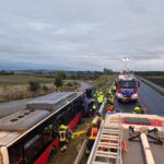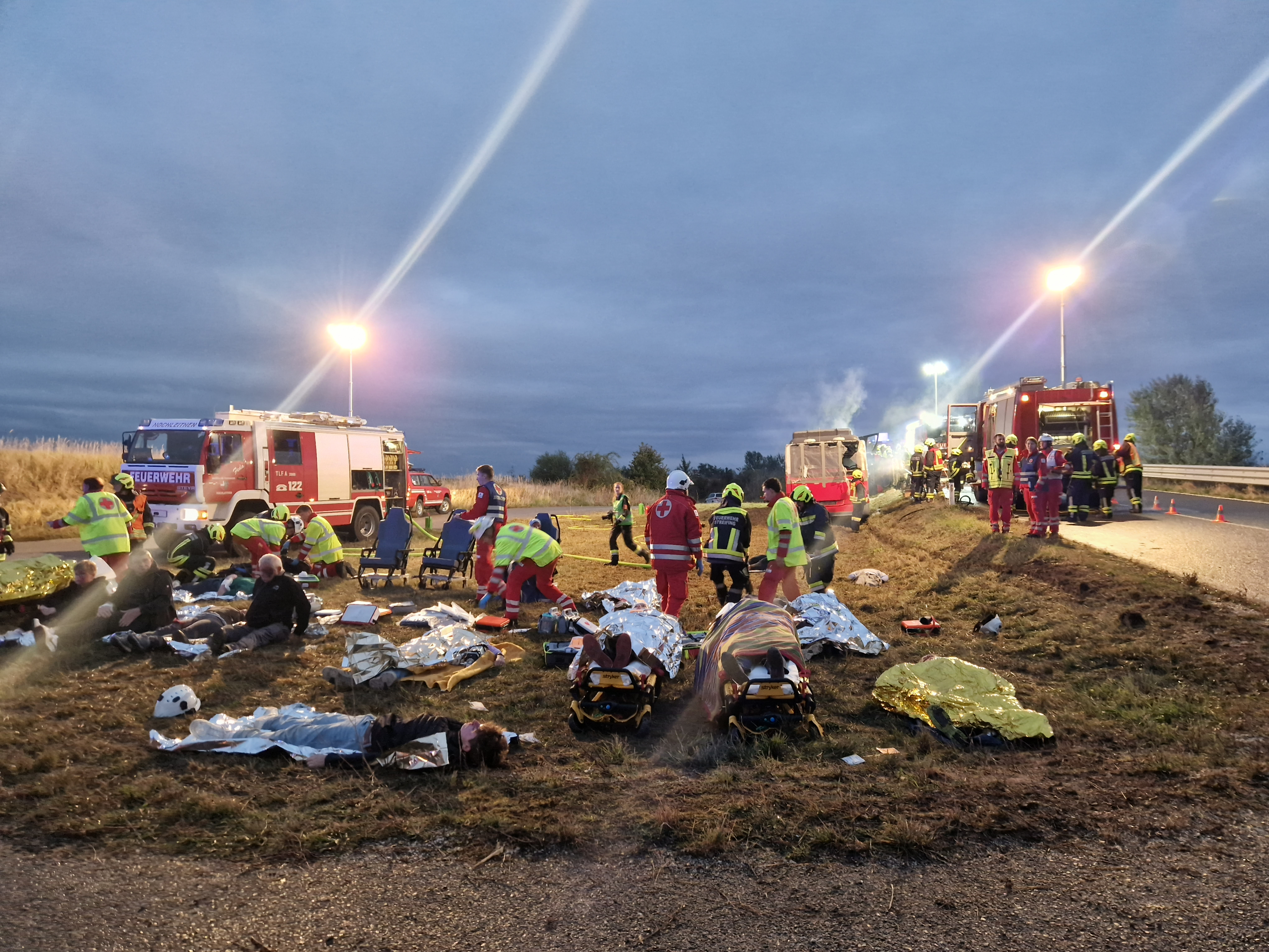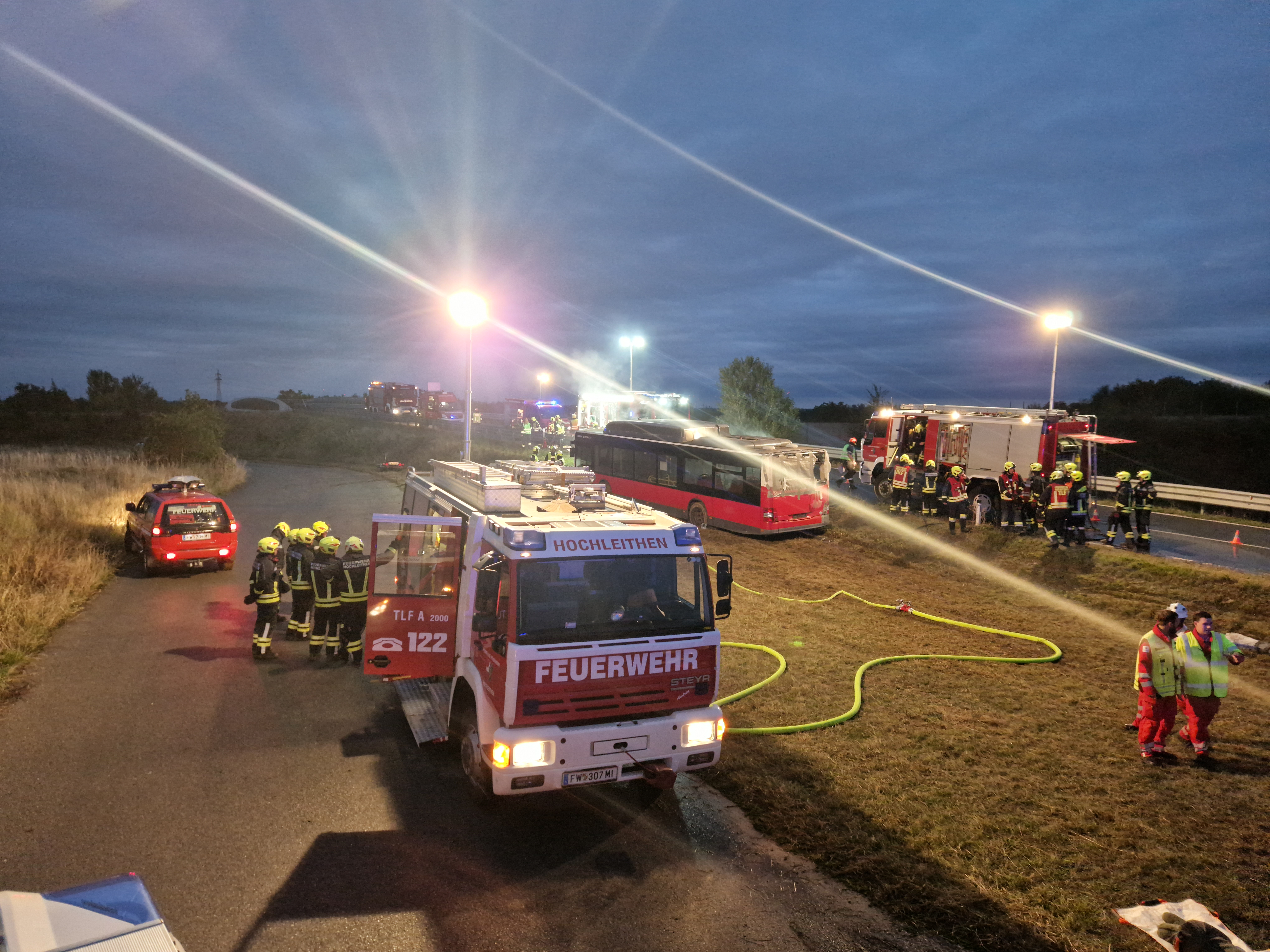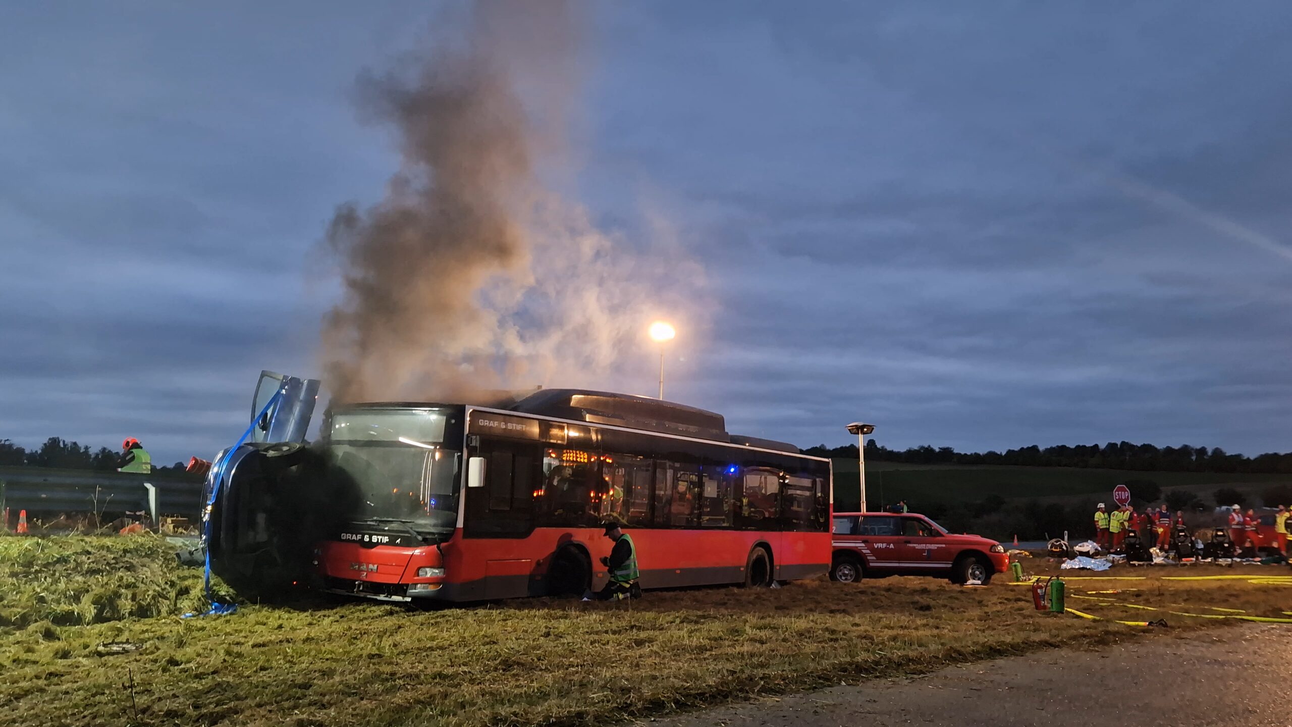 Die Übung nahm eine unerwartete Wendung für alle Anwesenden, als plötzlich Rauch über dem Linienbus aufstieg. Da ein Fahrzeugbrand angenommen wurde, rüsteten sich mehrere Atemschutztrupps zur Brandbekämpfung aus. Das Fahrzeug wurde mittels Wärmebildkamera auf Brandherde kontrolliert, wobei rasch Entwarnung gegeben werden konnte. Alle 23 verunfallten Personen konnten aus den Fahrzeugen gerettet und dem Rettungsdienst zur Erstversorgung übergeben werden.