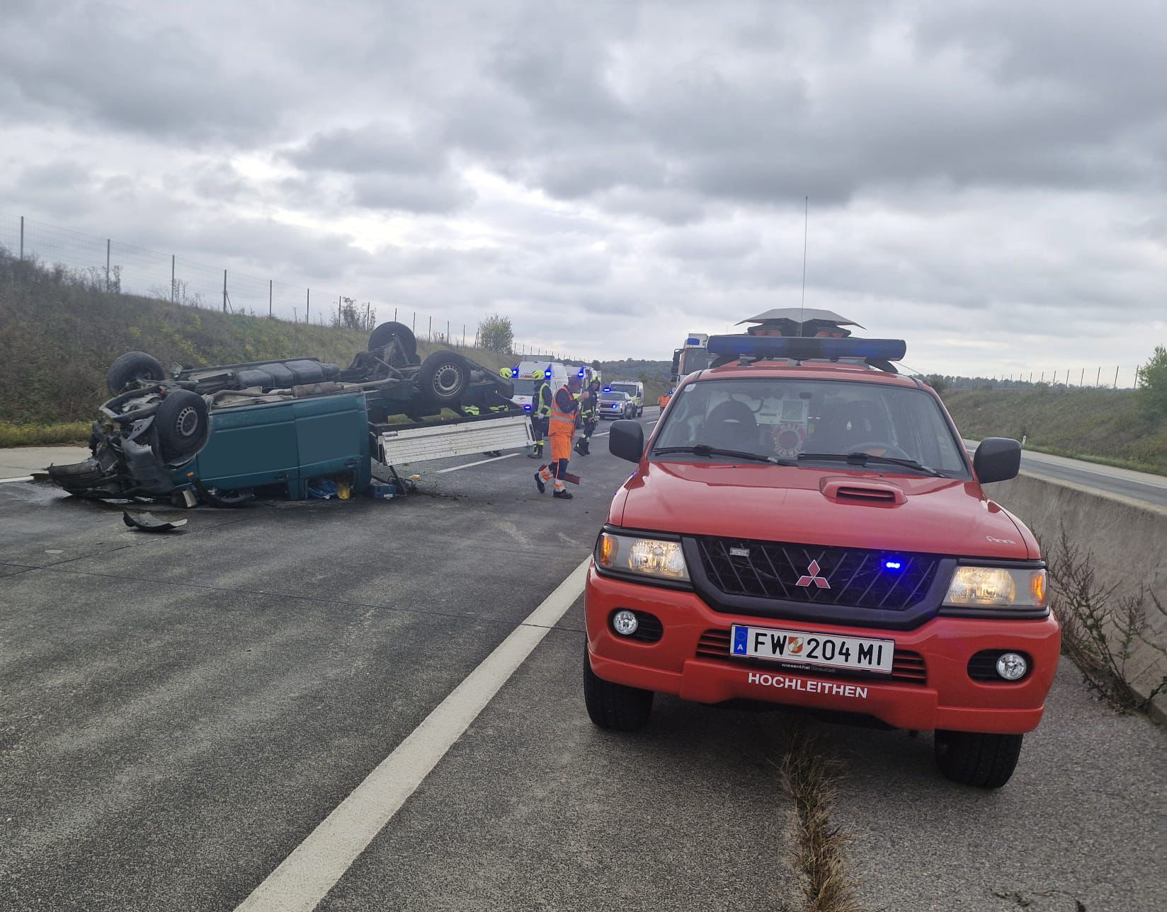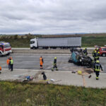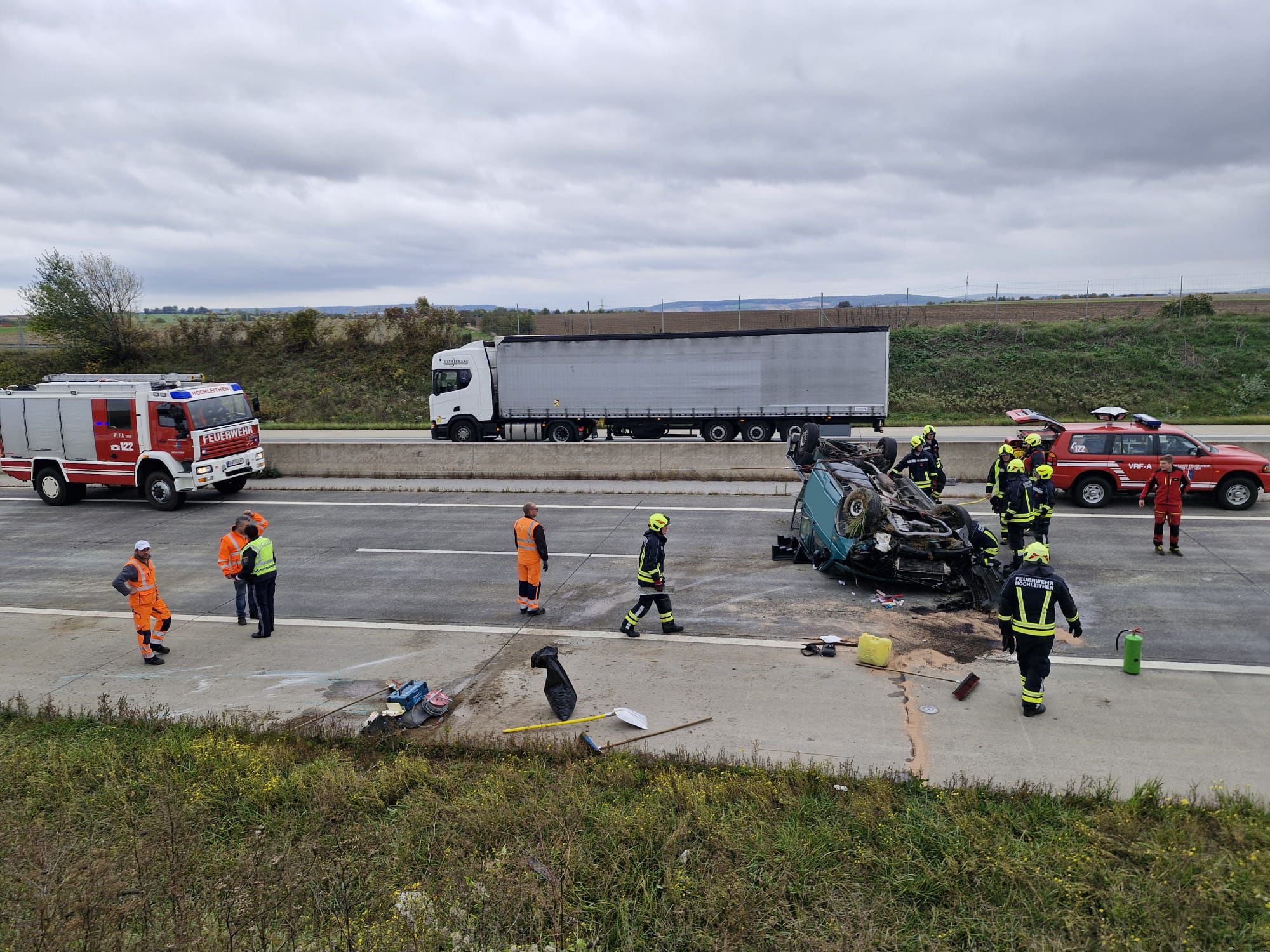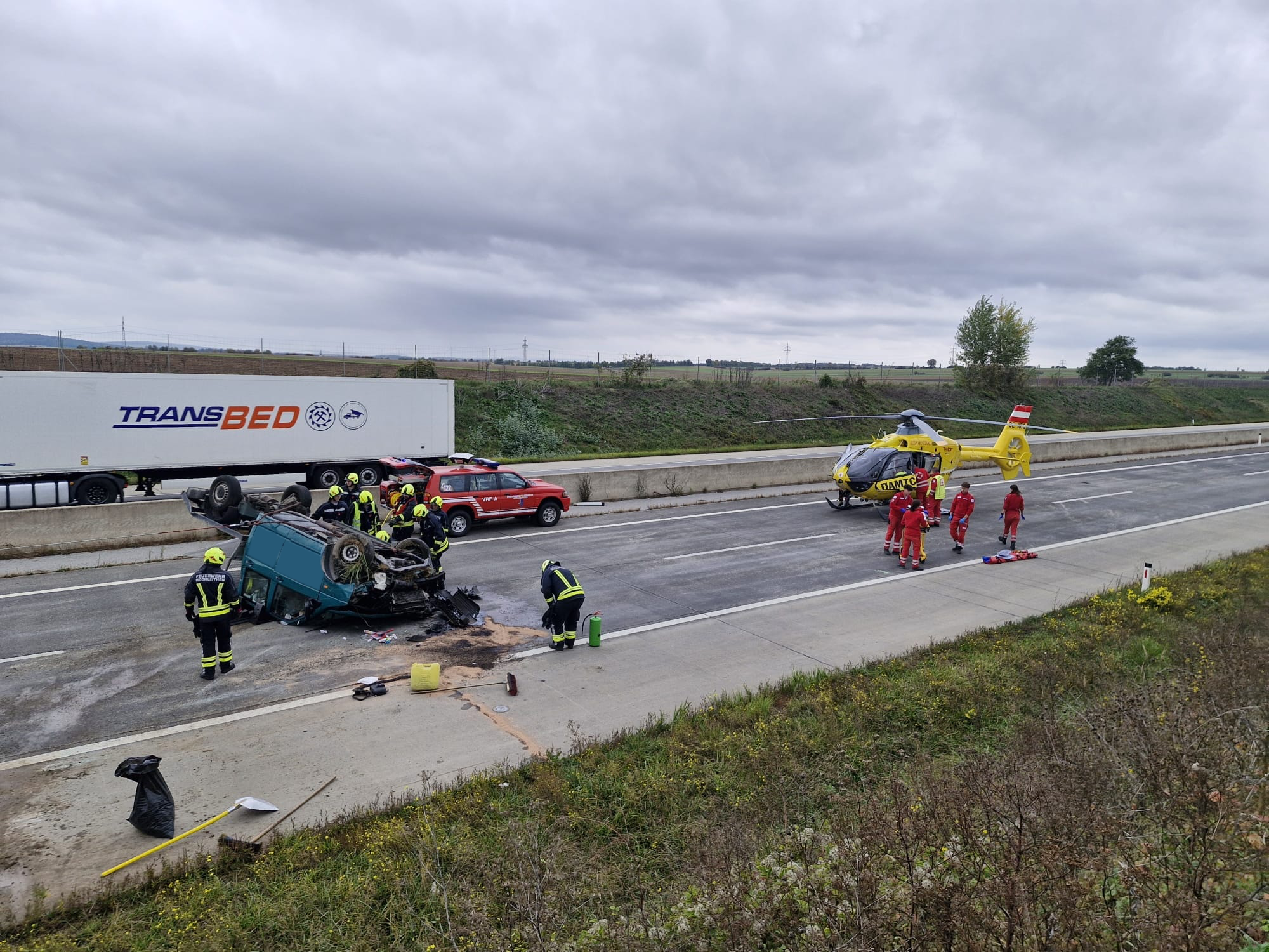Beim Eintreffen zeigte sich, dass ein PKW auf dem Dach lag. Die verletzte Person befand sich bereits außerhalb des Fahrzeugs und wurde von den Rettungskräften versorgt. Auch der Rettungshubschrauber war bereits vor Ort. Wir stellten den Brandschutz sicher und begannen im Anschluss mit den Aufräumarbeiten. Ausgelaufene Betriebsmittel wurden mit Ölbindemittel gebunden.