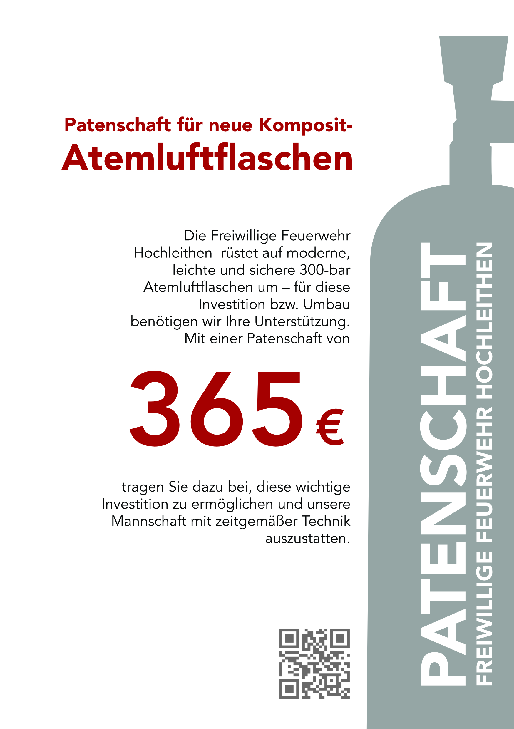 Derzeit verwenden wir ältere 200-bar-Flaschen, die nicht mehr dem heutigen Standard entsprechen und aktuell hohe Wartungskosten verursachen würden. Neue 300-bar-Kompositflaschen bieten deutlich weniger Gewicht und mehr Sicherheit für unsere Atemschutzträgerinnen und Atemschutzträger. Um diese wichtige Anschaffung zu ermöglichen, starten wir eine Patenschaftsaktion: