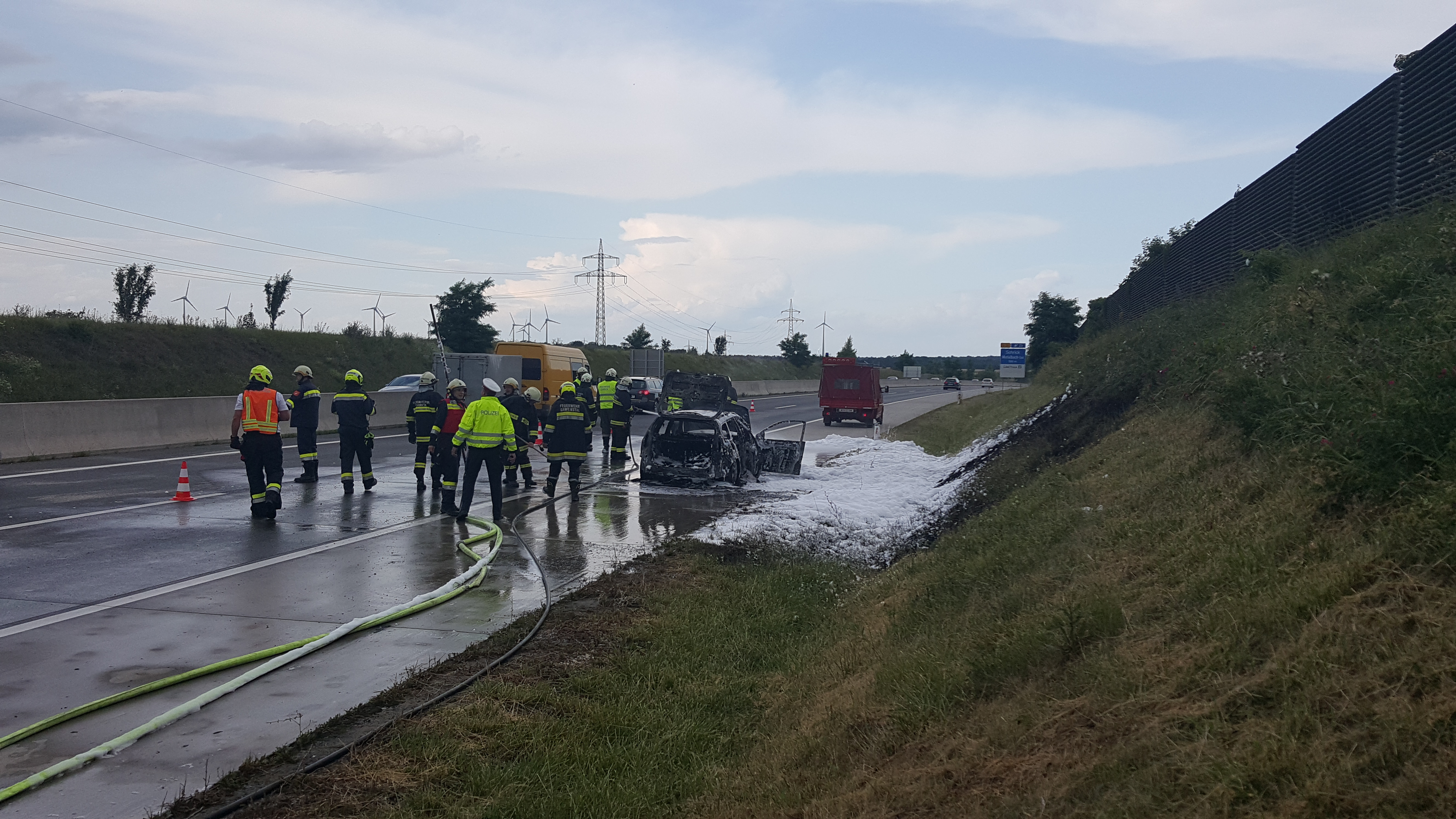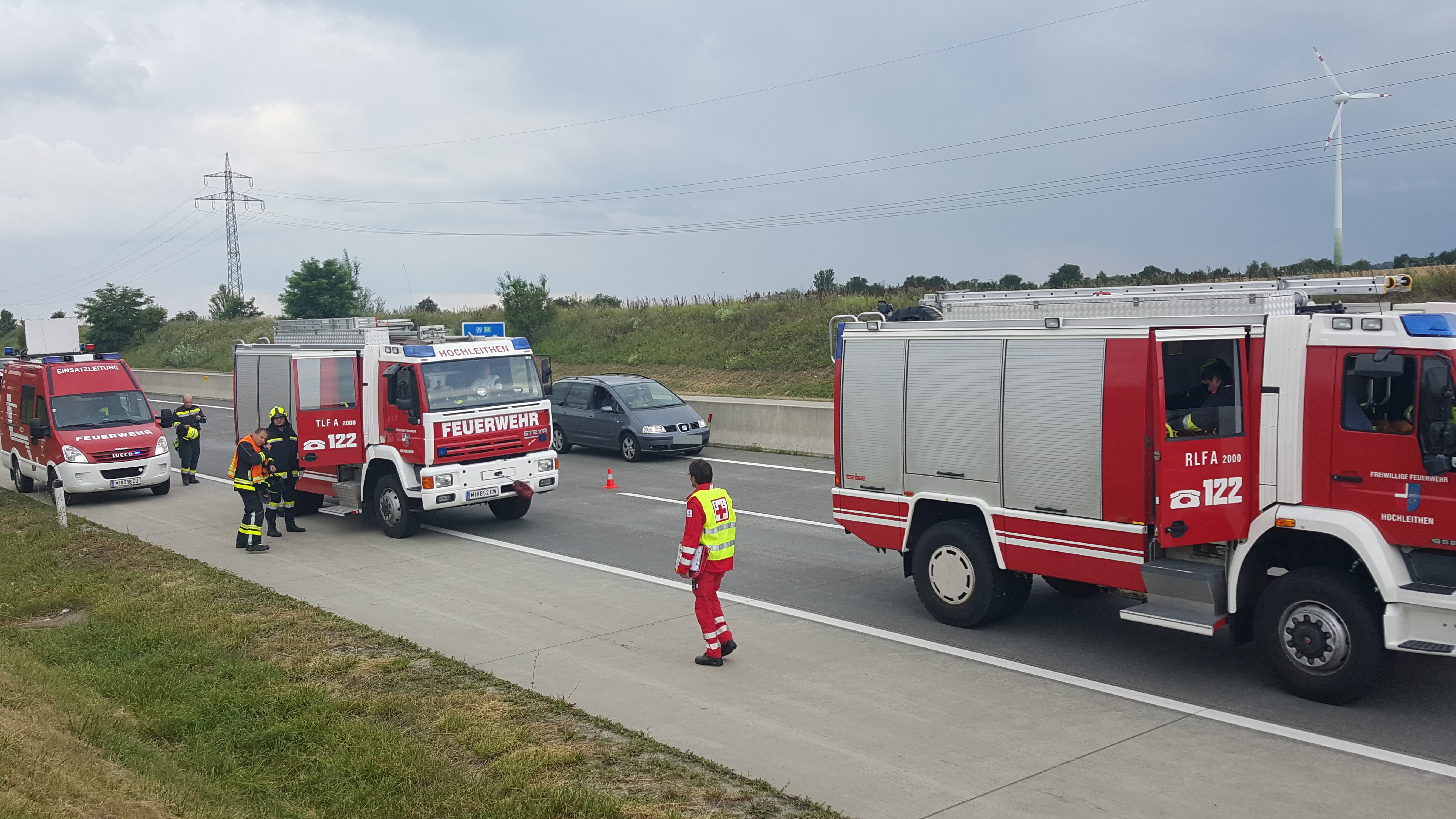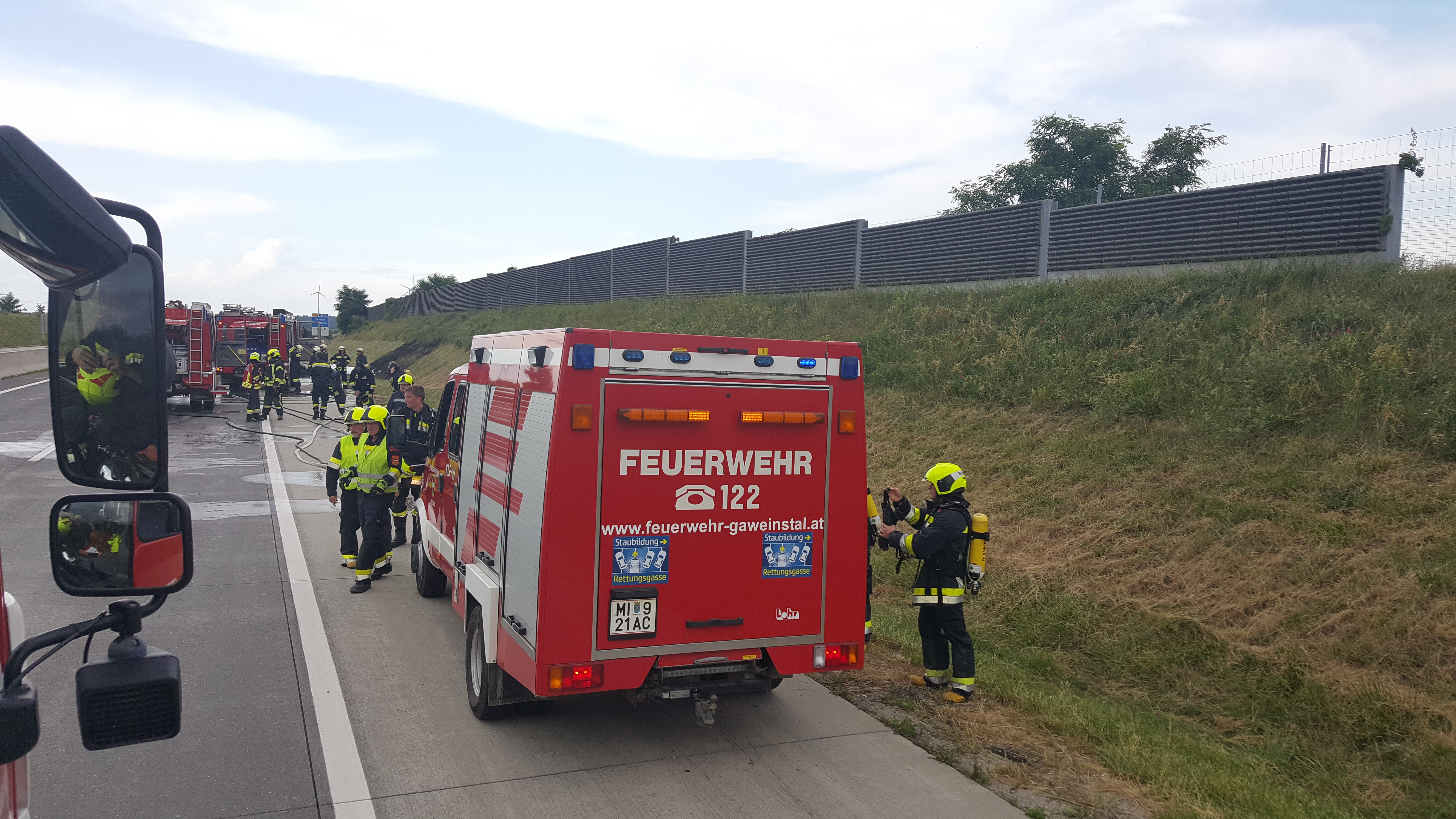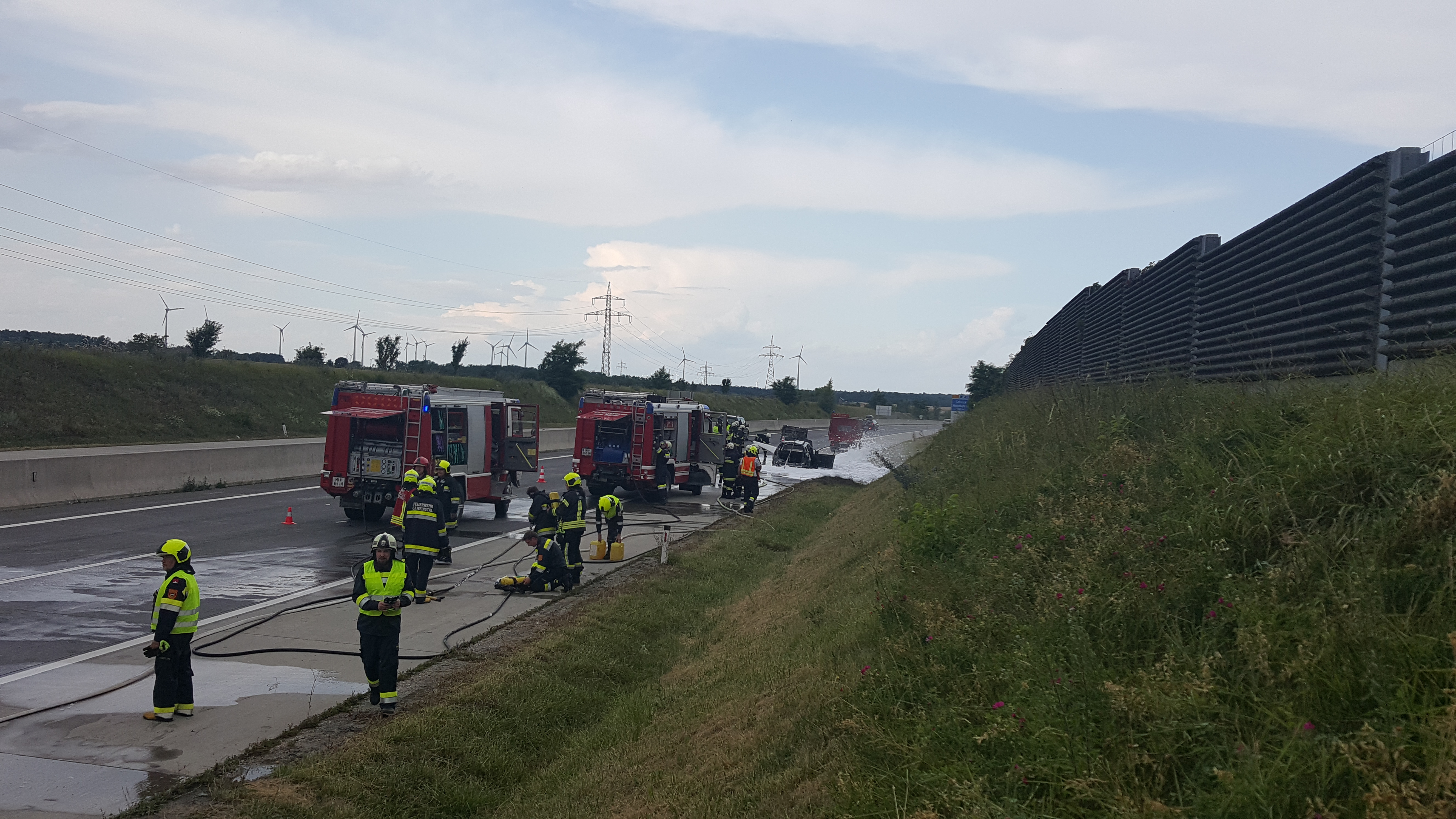 Am Sonntag wurden wir zur Unterstützung der Feuerwehren Schrick und Gaweinstal bei einem Fahrzeugbrand auf die A5 alarmiert. Anlass dafür war ein Brand eines PKWs, wobei sich der Brand bereits weiter auf die Böschung ausbreitete und zusätzliches Löschmittel benötigt wurde. Des Weiteren erhöhte sich das Gefahrenpotenzial aufgrund der Tatsache, dass der PKW mit einem Flüssiggastank ausgestattet war.