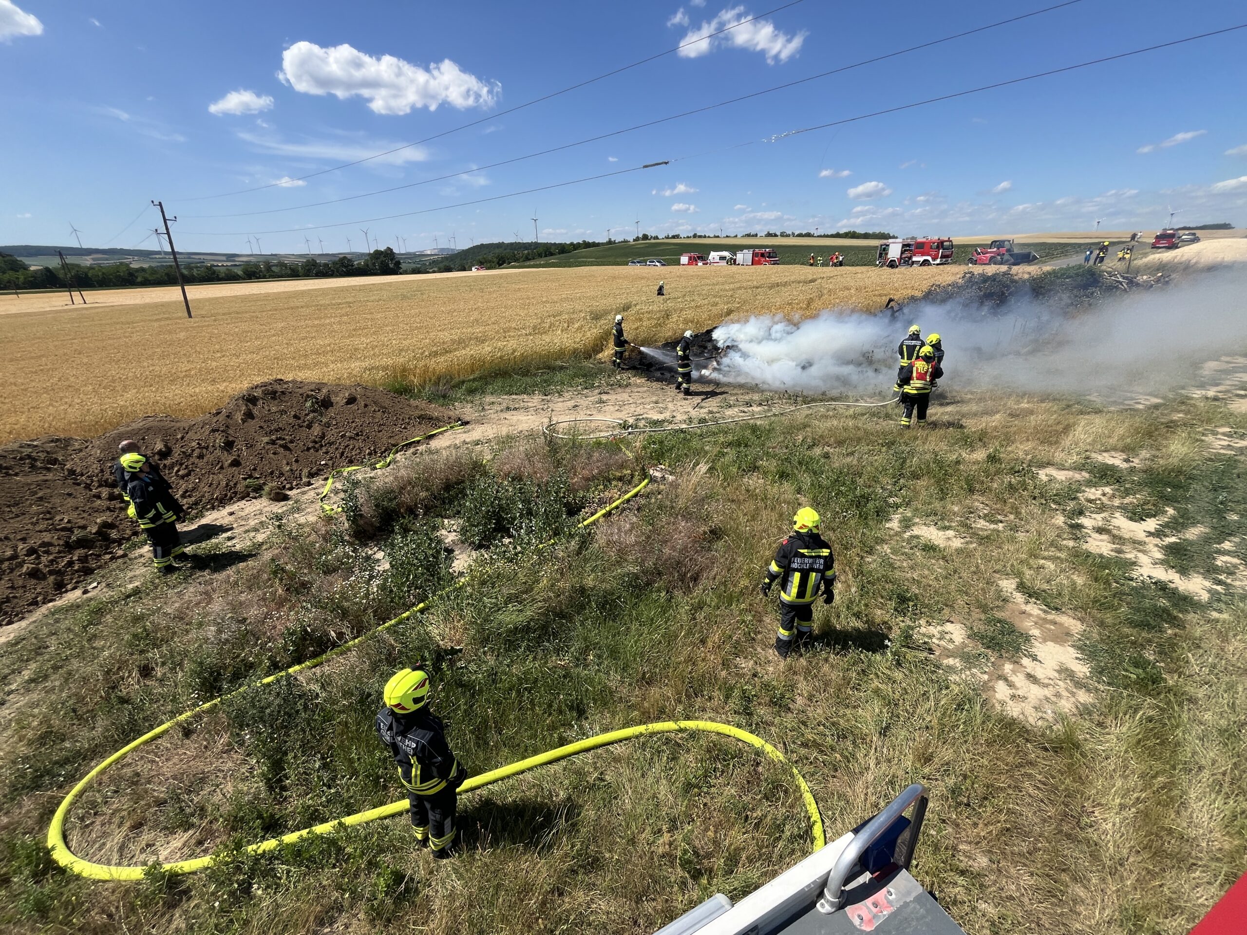 Ohne zu zögern besetzten wir das Tanklöschfahrzeug und nahmen die Fahrt zum Einsatzort auf. Dort angekommen, stellten wir fest, dass eine Grünschnittdeponie in Brand geraten war. Wir bauten sofort eine Löschleitung auf und unterstützten die bereits anwesenden Einsatzkräfte bei der Brandbekämpfung.