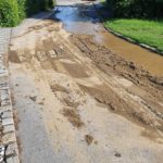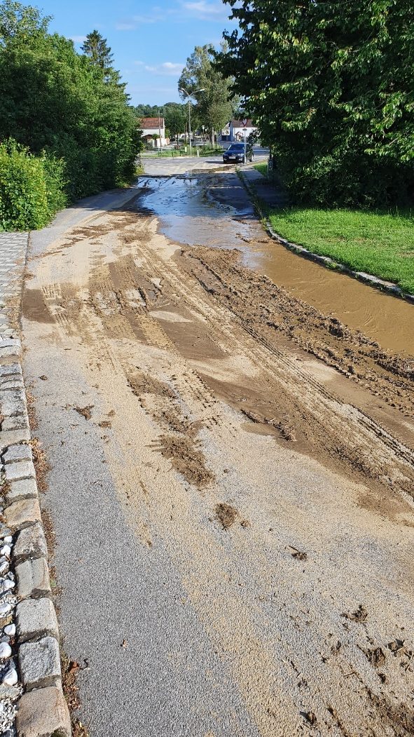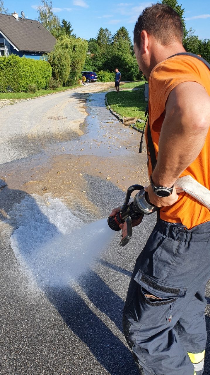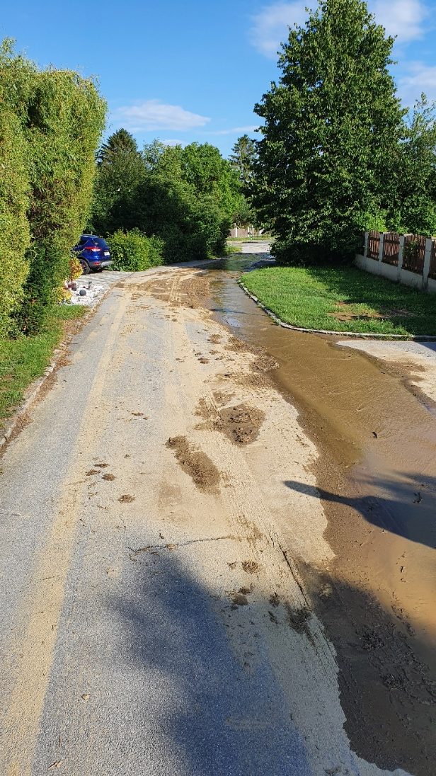 Ein Mitglied der Feuerwehr Hochleithen fand nach den starken Regenfällen vom Nachmittag, bei einer Fahrt durchs Gemeindegebiet, eine massiv verschlammte Straße vor. Daraufhin verständigte er kurzerhand einige Kameraden, welche kurz danach mit dem Rüstlöschfahrzeug in Richtung Linzbergstraße ausrückten. Ein Gemeindearbeiter war ebenfalls vor Ort und entfernte mit dem Frontlader des Gemeindetraktors die gröbsten Verunreinigungen. Im Anschluss daran wurden mittels Hochdruck-Schnellangriffseinrichtung sowie einer C-Schlauchleitung und Hohlstrahlrohr die verbliebenen Schlammreste entfernt. Nach rund 1,5 Stunden waren die Arbeiten beendet.