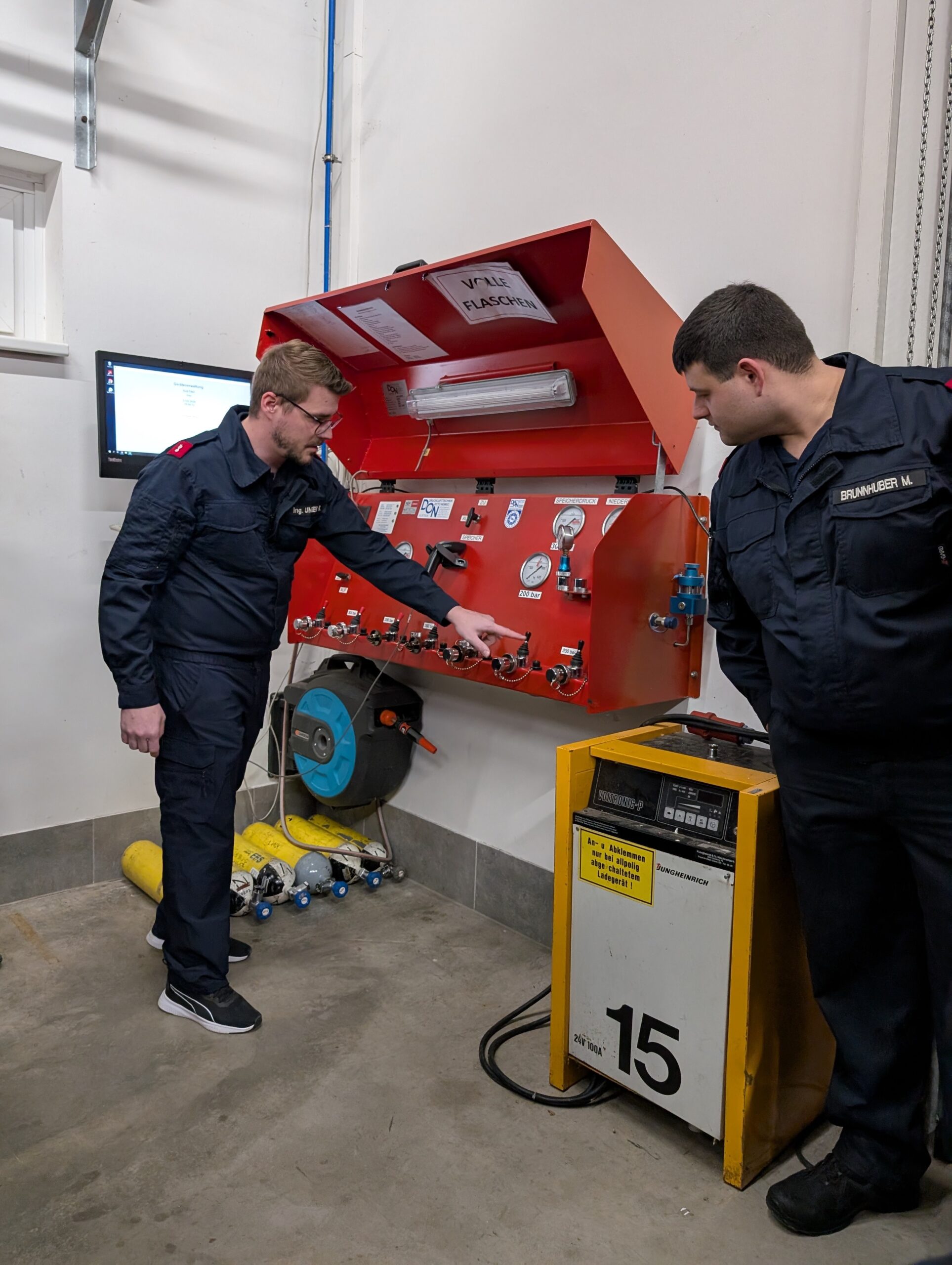 Im Anschluss daran folgte unter der Leitung von SB Rudolf Unger eine Schulung am neuen Atemluftkompressor, um das neue System kennenzulernen und das richtige Befüllen von Pressluftflaschen im Detail zu wiederholen.