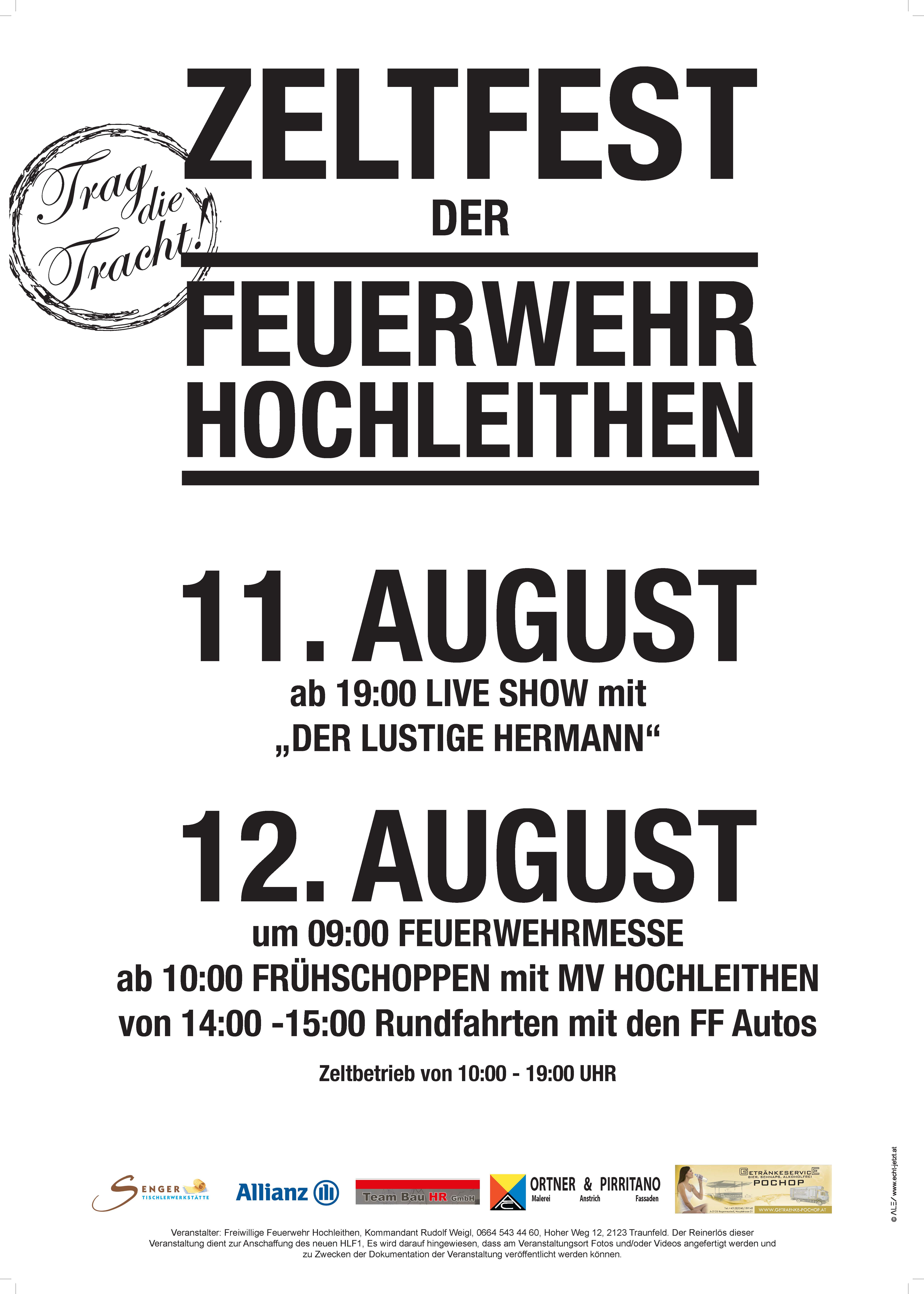 Wir laden Sie herzlich zum diesjährigen Zeltfest der Freiwilligen Feuerwehr Hochleithen ein.